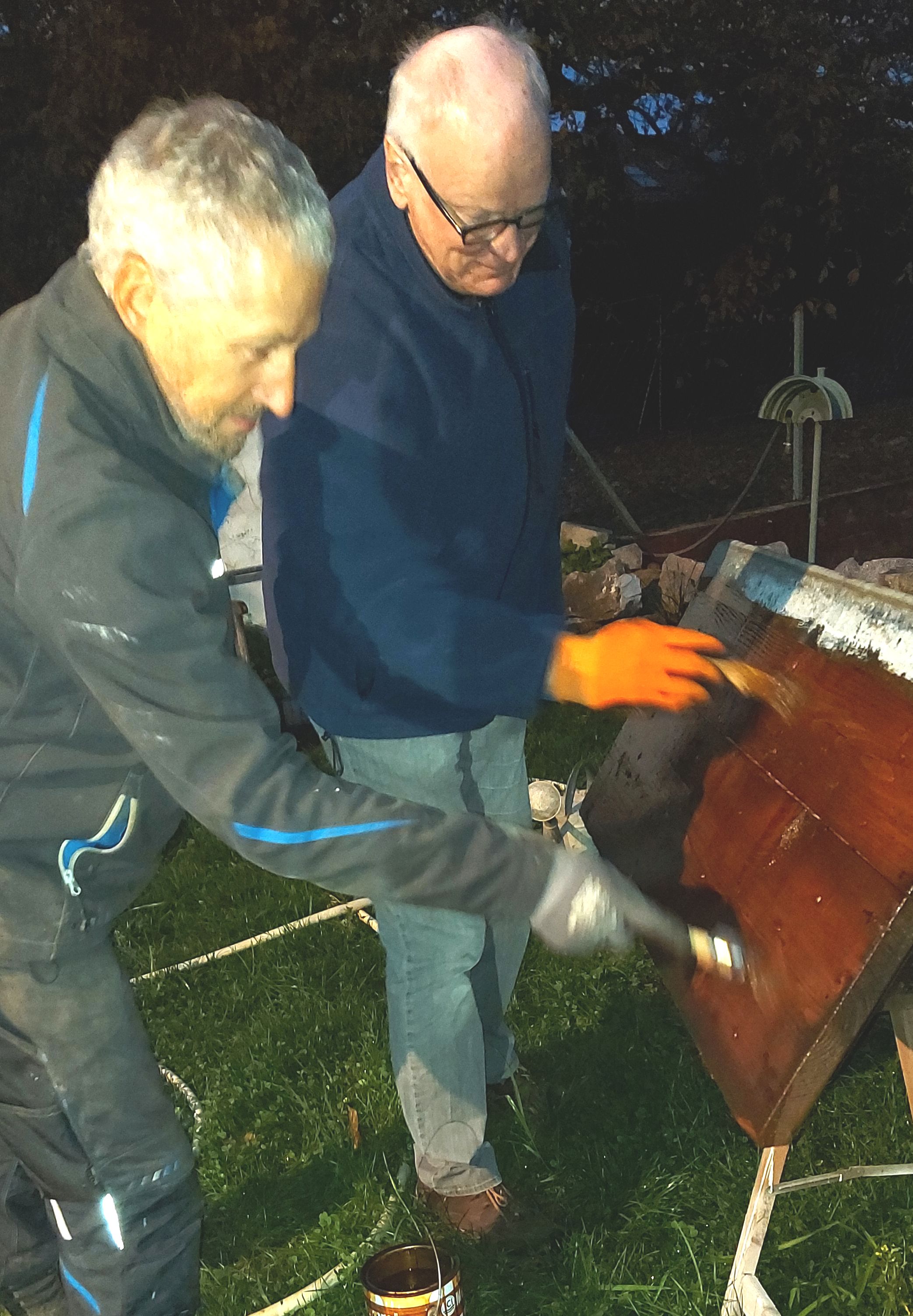 Von der Stadt Zwingenberg konnte man eine nicht mehr gebrauchte Schautafel aus Holz übernehmen, die in einem gemeinsamen Arbeitseinsatz restauriert und auf Vordermann gebracht wurde. Sie brauchte ein regenfestes Dach, da das bestehende durch die Witterung sehr stark in Mitleidenschaft gezogen worden war. Reste einer Carport Dacheindeckung taten ihren Dienst und konnten verwendet werden. Mit Hilfe einer Holz-Rahmenkonstruktion wurden die beiden Stahlträger im korrekten Abstand verbunden und mit Wasserwaage und synchronen Vorschlag-Hämmern im Boden am Teich versenkt. Die Schautafel wird so angebracht werden, das man sich am neu entstandenen Aussichtspunkt über den Teich und die darin lebenden Tiere informieren kann. Gleichzeitig wird sie aber auch vom nahegelegenen Wanderweg aus sichtbar sein. Weitere Bilder.