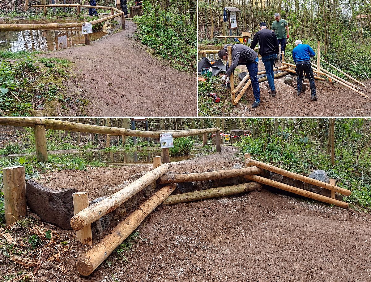 Heute ging es um die Herstellung einer Barriere zum Waldweg, die eine bessere Beobachtung des Teichs ermöglicht. Immer wieder hatten Fußgänger den glatten, schwer zu begehbaren Wall vom Waldweg zum Orbisteich bemängelt. Gerade wenn es geregnet hatte war dieser sehr glatt und damit gefährlich zu begehen. Mit der heute angelegten Barriere aus Holz und Natursteinen kann man nun ungefährdet viel näher an den Teich gelangen, ohne den Waldweg zu verlassen. Noch näher zum Teich gelangt man aber nach wie vor über den letztes Jahr geschaffenen breiten Zugangsweg weiter unten im Wald. Er ist bequem auch für Rollstühle und Kinderwagen geeignet und auch eine Sitzgelegenheit sowie die Schautafel lassen sich auf diese Weise erreichen.